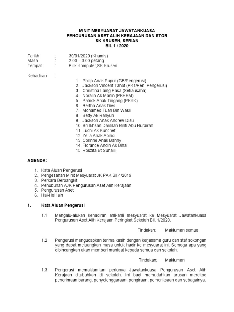 Minit mesyuarat pengurusan aset alih kerajaan jkpak kali pertama tahun 2018 sjkt ldg sg palas tarikh. Minit mesyuarat jawatankuasa aset 1 2015 shafy terrer. 3 2020 Tarikh.
